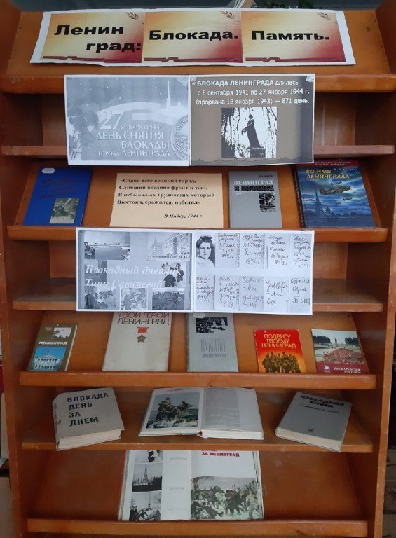 В районной библиотеке к этой дате оформлена книжная выставка "Ленинград. Блокада. Память". В книгах, представленных на выставке, рассказывается о беспримерном подвиге осажденного фашистами Ленинграда, о мужестве и героизме его жителей, сумевших выстоять в нечеловеческих условиях блокады, переживших страшный голод, страдания, смерть близких.