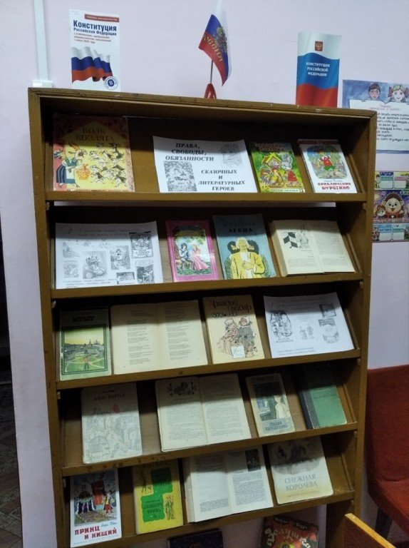 В канун празднования Дня Конституции Российской Федерации читателей районной детской библиотеки порадовала выставка «Права, свободы, обязанности сказочных и литературных героев». На ней представлено более 20 произведений, в которых присутствуют нарушения конституционных прав героев. Наиболее яркие эпизоды правонарушений: статья 20, статья 40 п. 1, статья 22 п. 1, статья 43 п. 1, статья 21 п. 2.